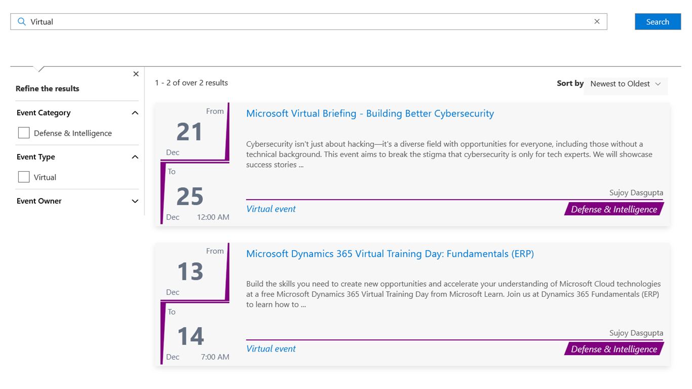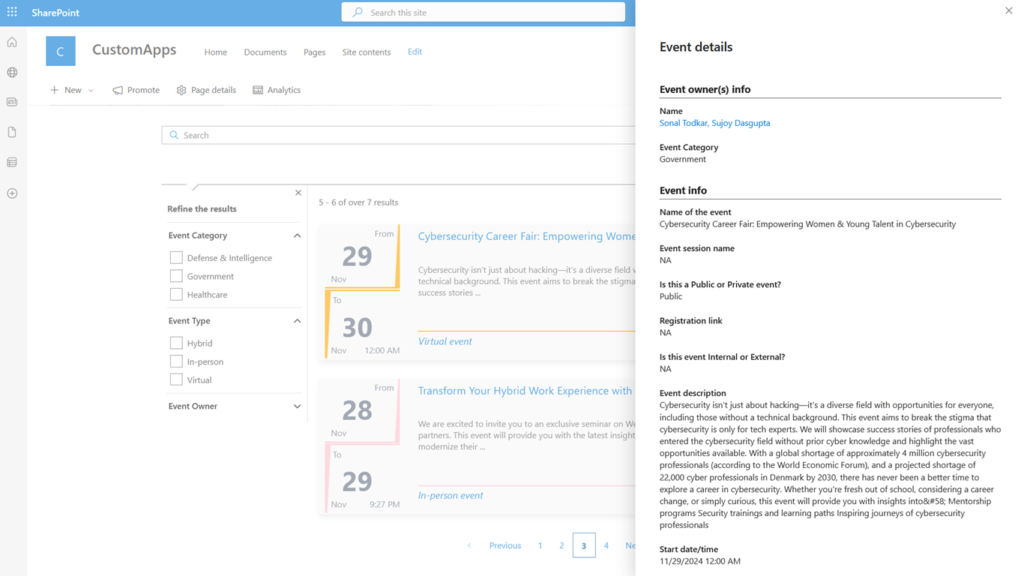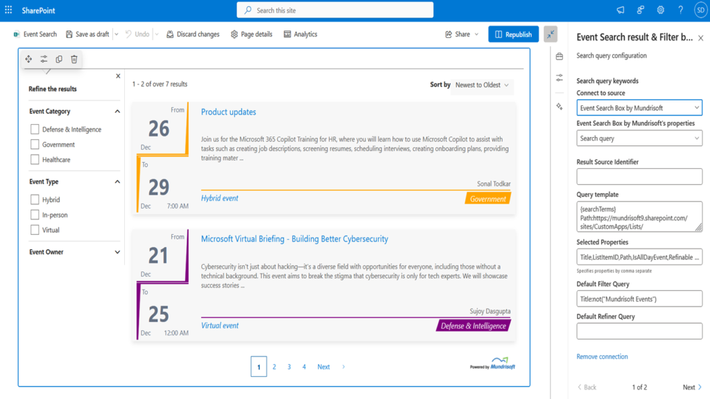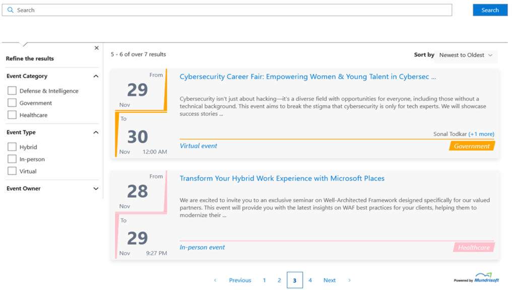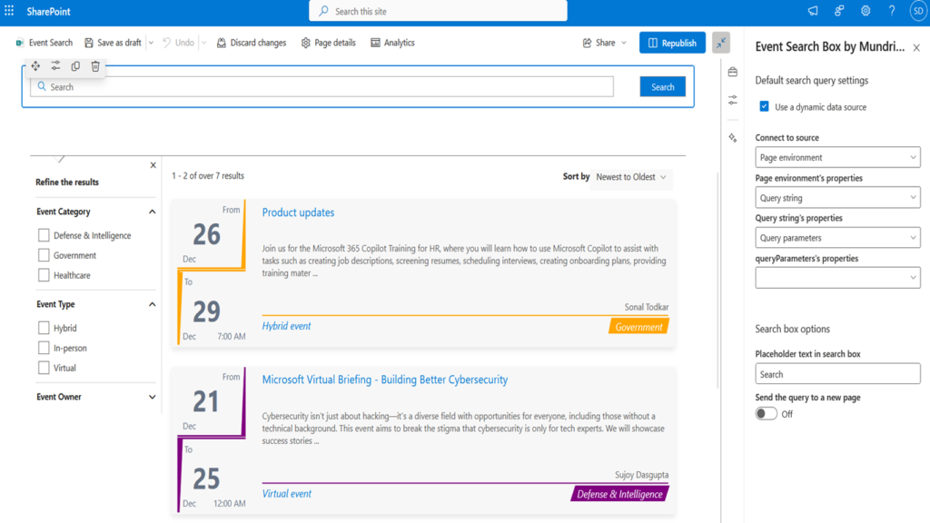 The Event Search Box & Event Search Result & Filter custom SPFx web part is designed to help users quickly find and filter events on a SharePoint page. This web part is especially valuable in environments with a high volume of events, allowing users to refine their search based on specific criteria, view relevant event details, and navigate events that meet their interests or needs.