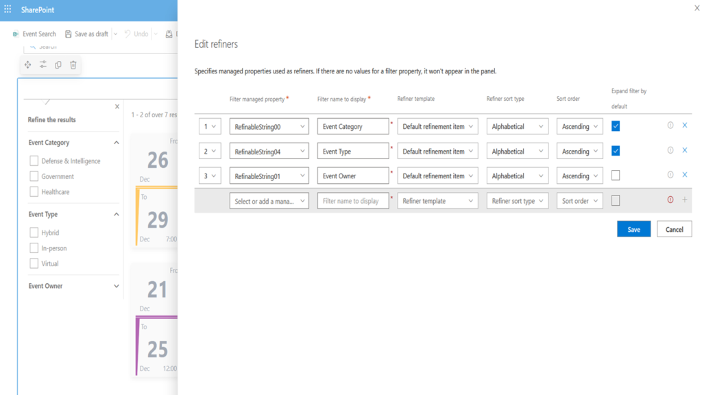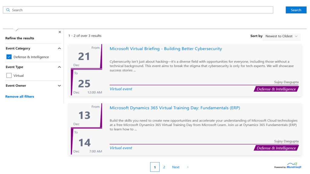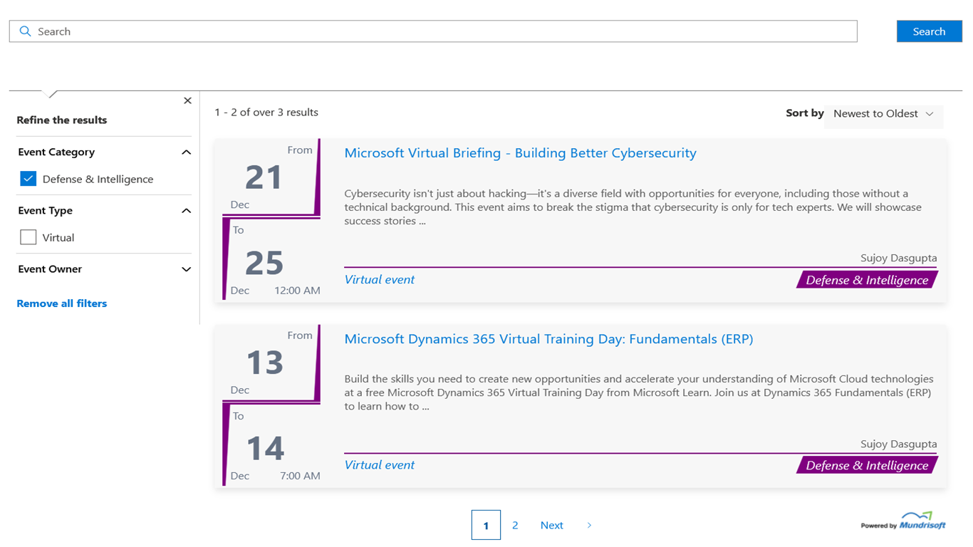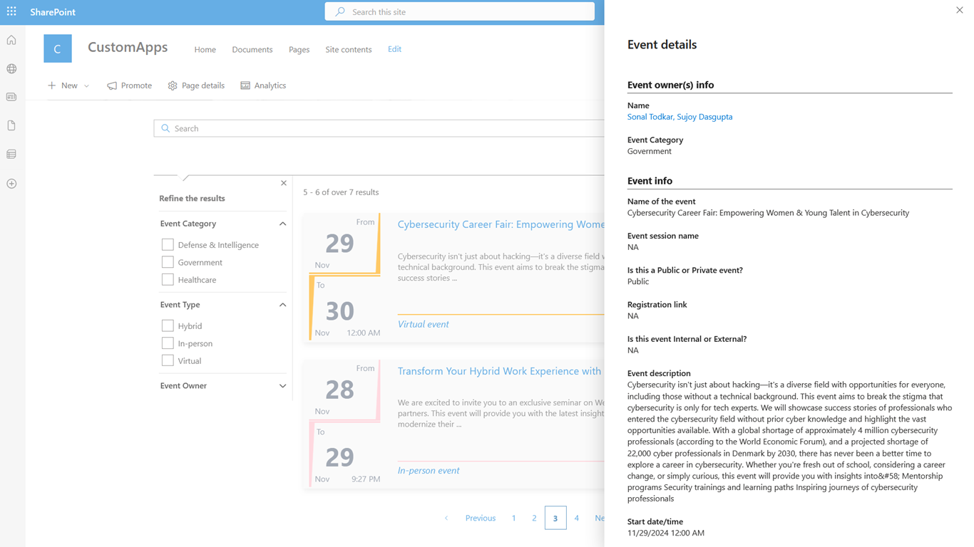 The Event Search Box & Event Search Result & Filter custom SPFx web part is designed to help users quickly find and filter events on a SharePoint page. This web part is especially valuable in environments with a high volume of events, allowing users to refine their search based on specific criteria, view relevant event details, and navigate events that meet their interests or needs.
